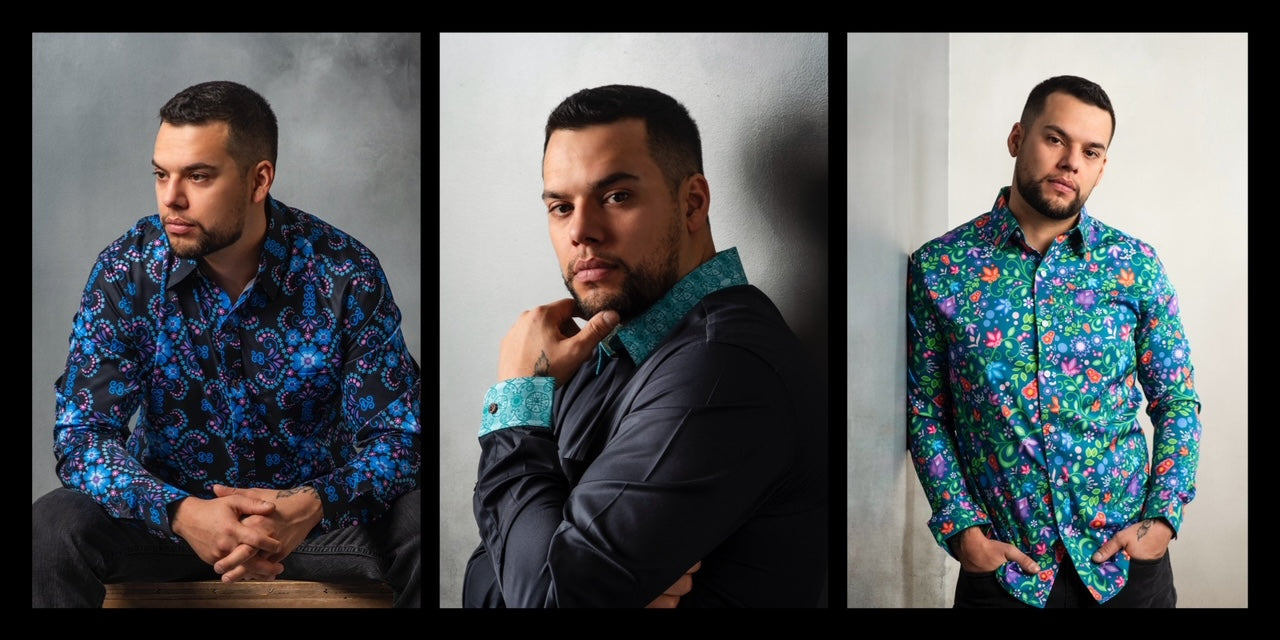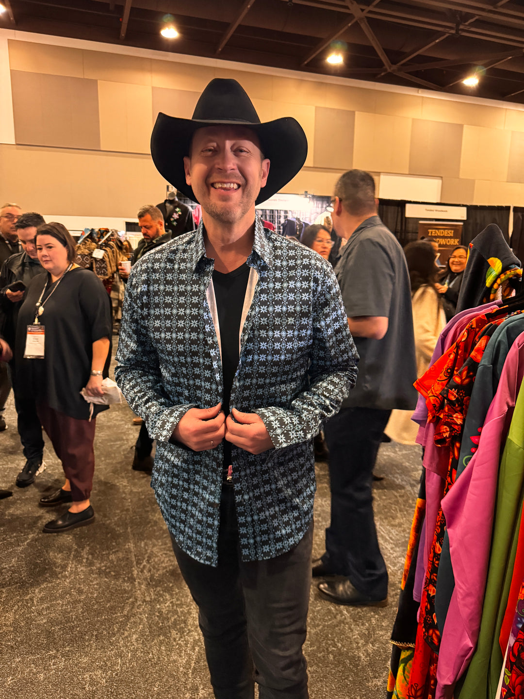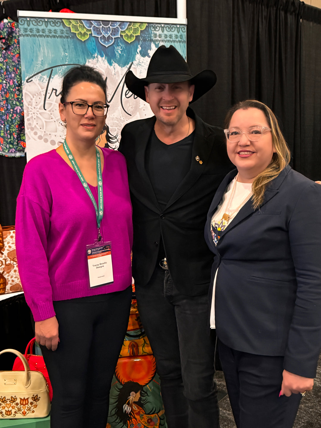 Canadian Country Singer Paul Brandt and National Chief Cindy Woodhouse came to visit my booth at the Assembly of First Nations Event in Ottawa, November 2024. He's wearing one of my men's dress shirts!
